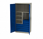 Шкаф инструментальный серии «PROFFI» предназначен для хранения оснастки, приспособлений и инструмента на рабочих местах в мастерских, цехах и других производственных зонах. Шкаф изготовлен из листовой стали и обеспечивает надежное запирание дверей ригельной системой. Шкаф содержит четыре ящика, одна перегородка и восемь полок. Размеры:(ВхШхГ) 1800x1000x500 мм. Масса: 71,4 кг. Нагрузка на полку – не более 100 кг. Нагрузка на перекладину - не более 15 кг. Суммарная нагрузка на шкаф не более 400 кг.
