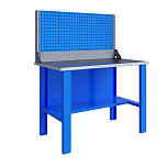 Однотумбовый. Допустимая нагрузка на столешницу 750 кг. Опорные элементы выполнены сварными из холоднокатаной стали. Верстак состоит из опоры, тумбы P7 с дверью и двумя полками и полки-стенки. Все металлические элементы покрыты полиэфирной порошковой краской. Столешница состоит из фанеры марки ФСФ толщиной 24 мм, которая покрыта лаком-антисептиком и листом оцинкованной холоднокатаной стали толщиной 1,2 мм. Размеры (ВхШхГ) 855x1196x696 мм.