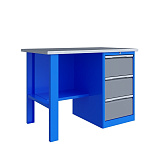 Однотумбовый. Допустимая нагрузка на столешницу 750 кг. Опорные элементы выполнены сварными из холоднокатаной стали. Верстак состоит из столешницы, опоры, тумбы P3 с тремя большими ящиками, полки-стенки и одинарного экрана с кронштейнами. Все металлические элементы покрыты полиэфирной порошковой краской. Столешница состоит из фанеры марки ФСФ толщиной 24 мм, которая покрыта лаком-антисептиком и листом оцинкованной холоднокатаной стали толщиной 1,2 мм. Размеры (ВхШхГ) 1470x1196x696 мм.