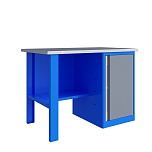 Однотумбовый. Допустимая нагрузка на столешницу 750 кг. Опорные элементы выполнены сварными из холоднокатаной стали. Верстак состоит из  опоры, тумбы P7 с дверью и двумя полками и полки-стенки. Все металлические элементы покрыты полиэфирной порошковой краской. Столешница состоит из фанеры марки ФСФ толщиной 24 мм, которая покрыта лаком-антисептиком и листом оцинкованной холоднокатаной стали толщиной 1,2 мм. Размеры (ВхШхГ) 855x1196x696 мм.