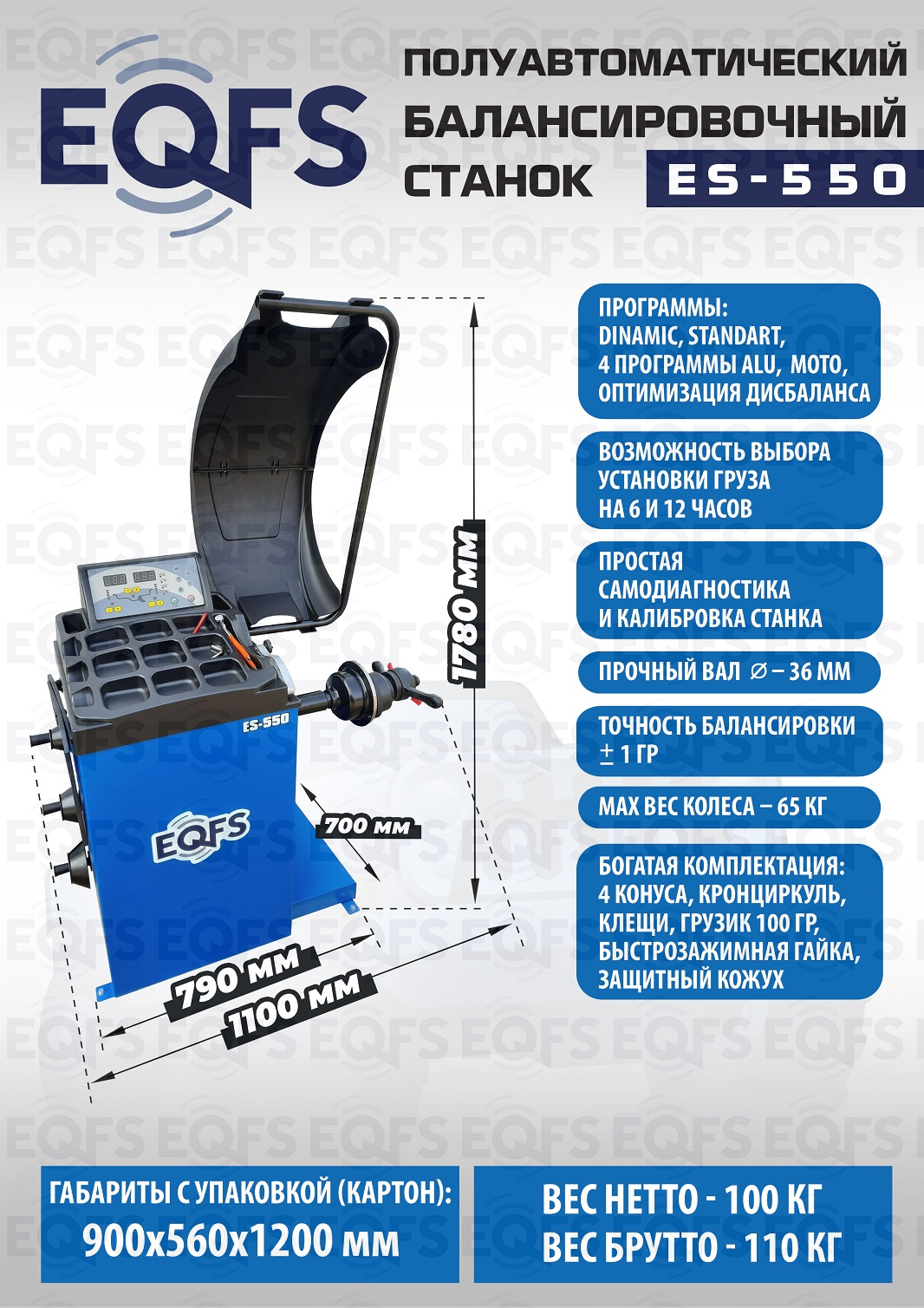 ES-550 Балансировочный станок. Полуавтомат. Удобный и понятный интерфейс. Автозапуск опусканием кожуха. Автоматический ввод дистанции и диаметра диска. Лазерная навигация. Автокалибровка. Для колес легковых автомобилей, мотоциклов, «Газелей», «Спринтеров» с диаметром диска с резиной до 800 мм. Размеры диска: ширина 3–10” (76-254 мм) , диаметр диска 10–24” (254÷609 мм). Вес ≤ 65 кг. Вал- 36 мм. Точность ±1гр. 220 В. Режимы работы DINAMIC, STATIC, ALU1, ALU2, ALU3, ALUS, ST. Гарантия 12 мес. В комплекте: кожух с автозапуском + клещи + кронциркуль + быстрозажимная гайка + набор конусов.