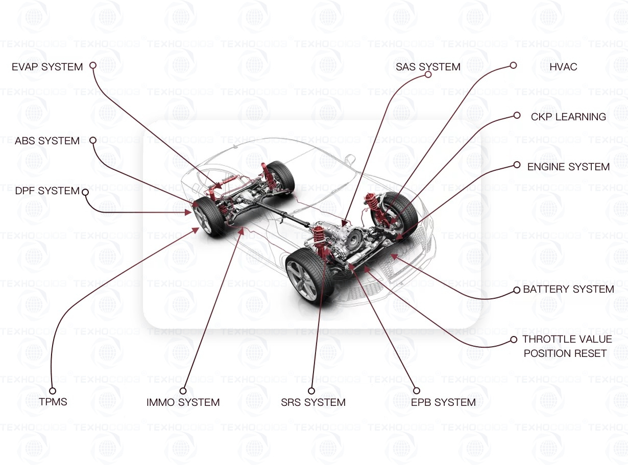 • Поддержка дополнительных модулей: Осциллограф, Тестер АКБ, Тестер датчиков TPMS, Видеоэндоскоп