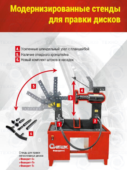 Стенд для правки дисков «Фаворит-П» предназначен для правки литых и кованых легкосплавных дисков от 10 до 22 дюймов включительно (до 22-х дюймов - используя мобильный кронштейн). Вал изготовлен из инструментальной стали 50Х с повышенной  износостойкостью и прочностью. Добавлен электрический привод вращения шпинделя, предназначенный для облегчения поиска зоны правки диска, что, безусловно, повышает производительность труда и качество работ.